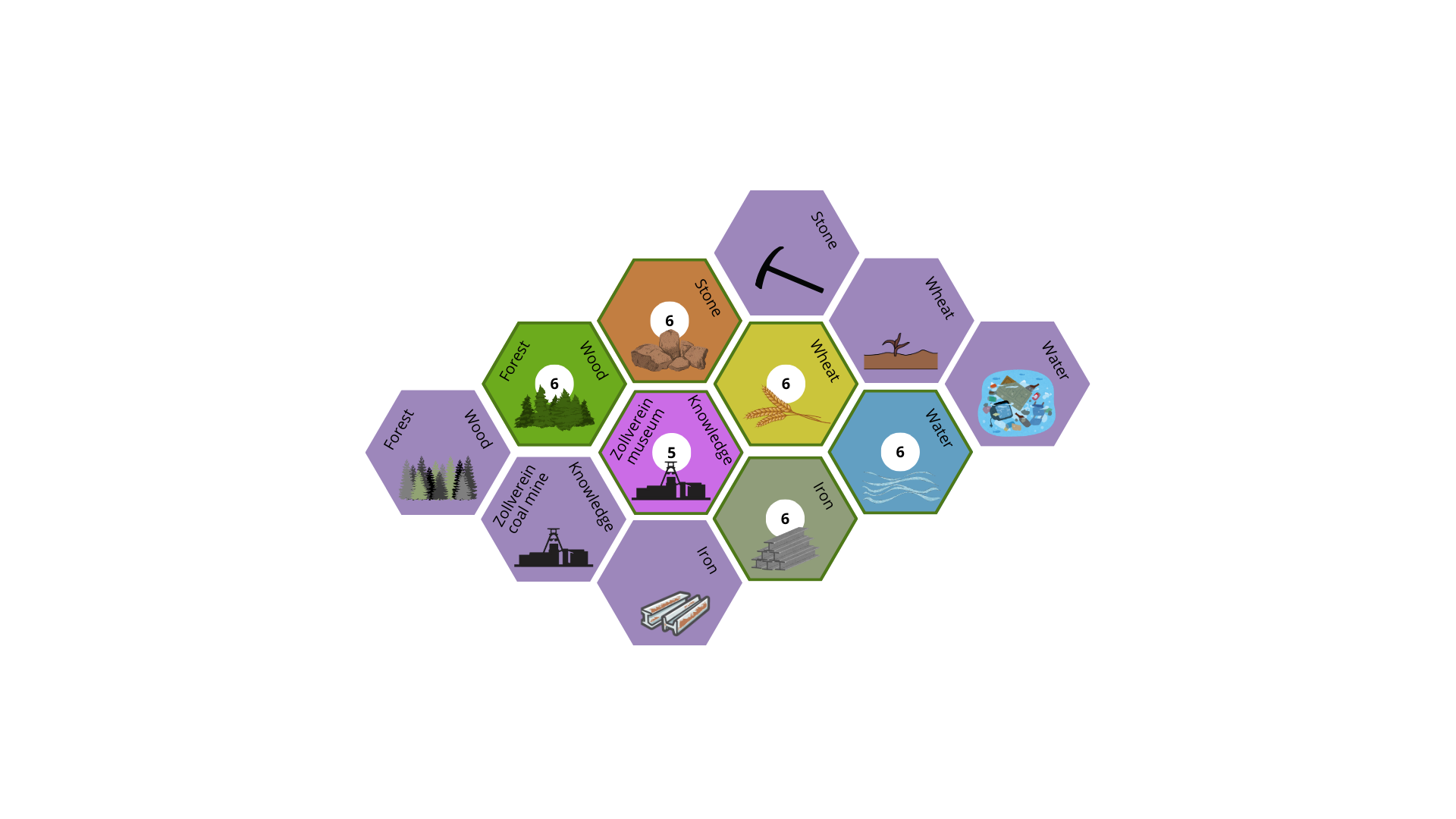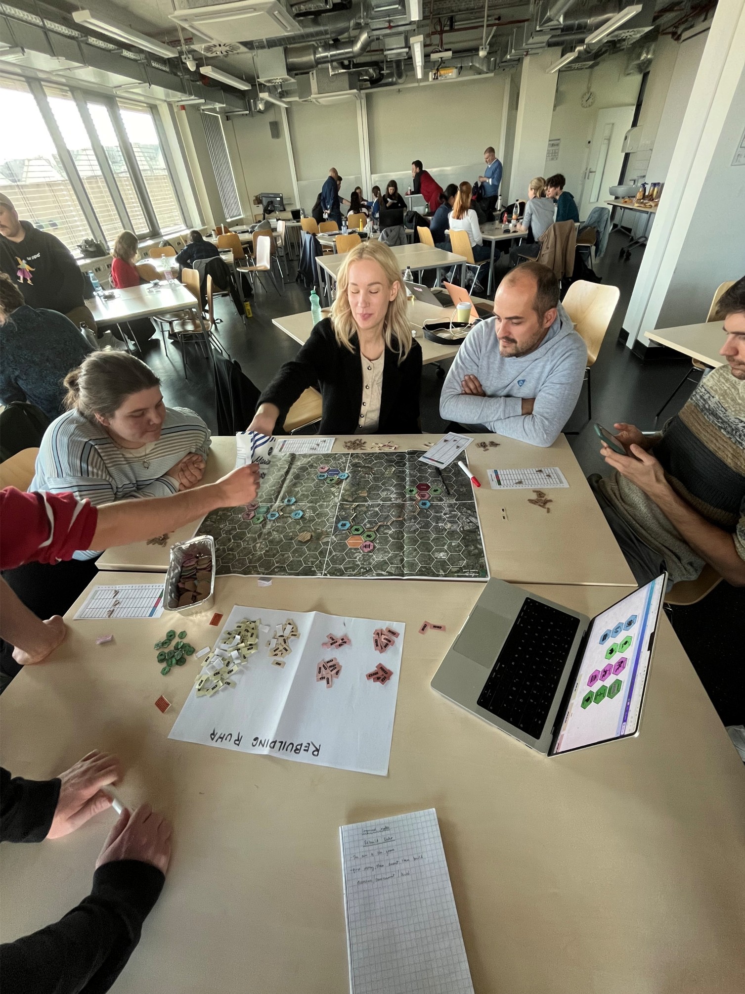 • Elmiina’s group created a board game that took inspiration from existing board games My City and Catan. The created game is located in the Ruhr area, and players are mayors of different cities, who work both independently and together to improve the sustainability of their cities and the area. The game starts with outdated industries and a polluted nature. During the game, players negotiate and use resources to improve the area. The learning goals of the game are to educate the players about sustainable change of land use and highlight the importance of cooperation.